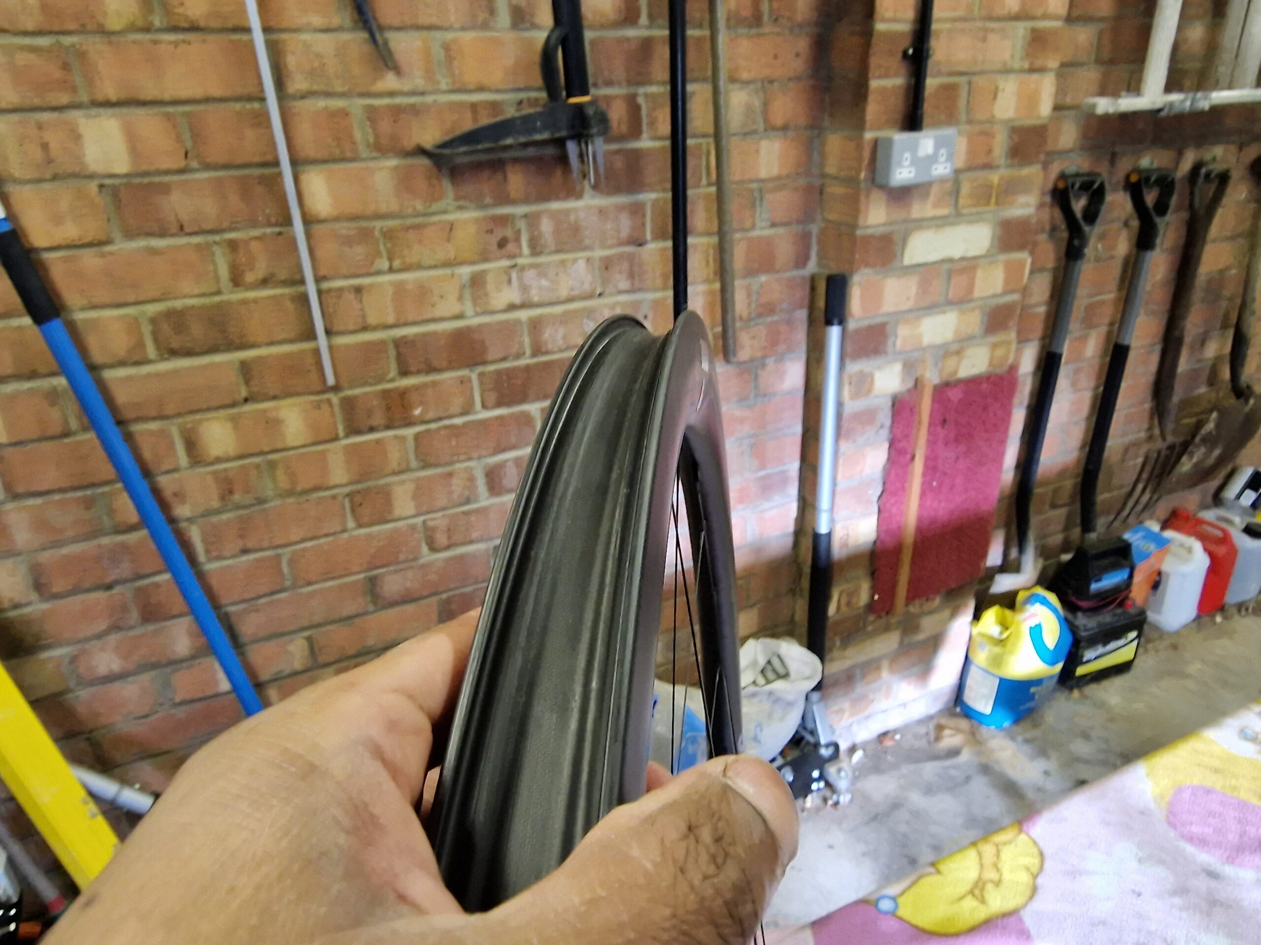 The wheel rims are of carbon construction. The outer width is approximately 28mm with an internal width of 21mm. The rims are hooked. There are no spoke holes, so rim tape is not required. This is advantageous from an inertial perspective as it reduces the inertia of the wheels (so they accelerate faster), but it does mean you’ll need a magnet and some patience if you have to change a spoke.