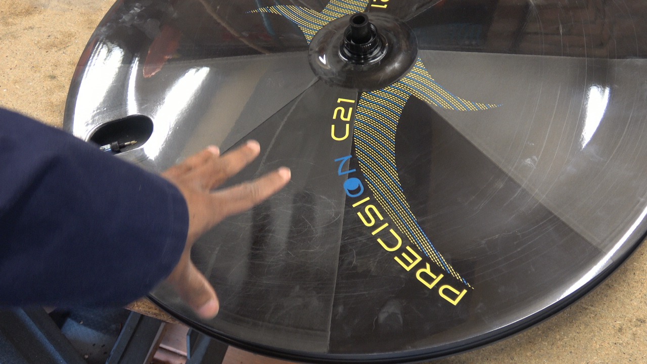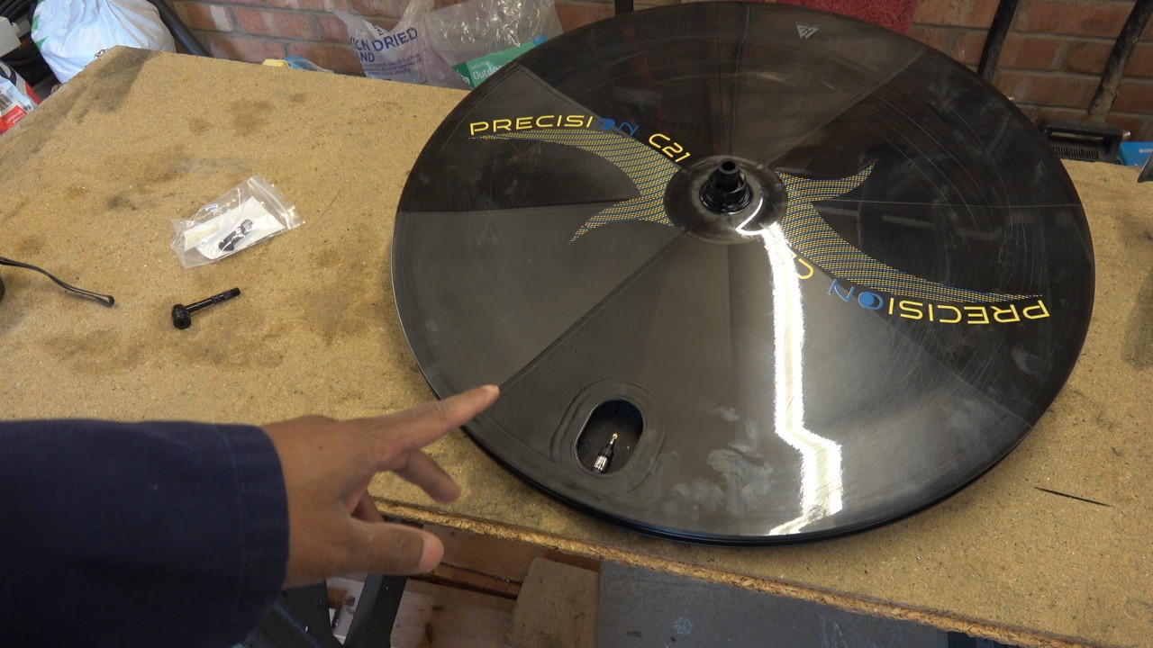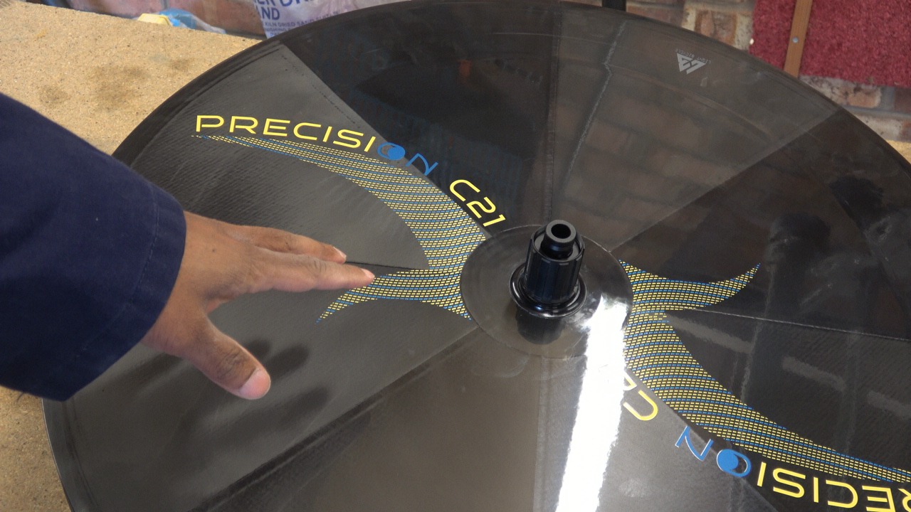 The Precision C21 features a unibody construction, meaning it is not merely a cover over a conventional spoked wheel. The center houses the DT Swiss hub, while the remainder of the disc is bonded in place. The disc’s boundary is a composite material sandwich, incorporating two carbon fiber skins with a central foam section. This design makes the wheel notably lightweight for a full disc.