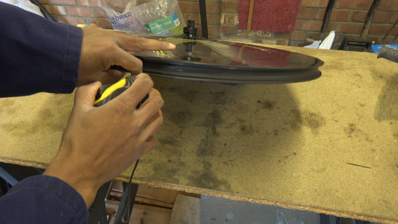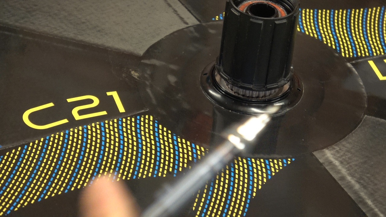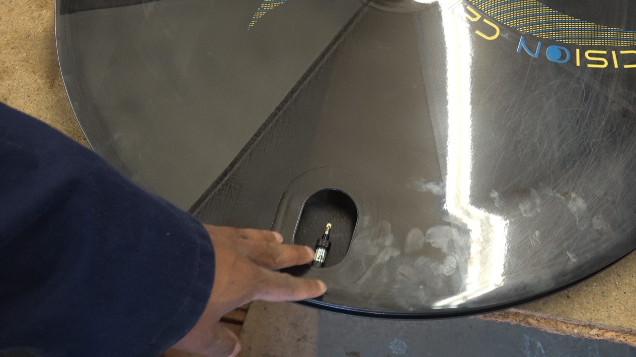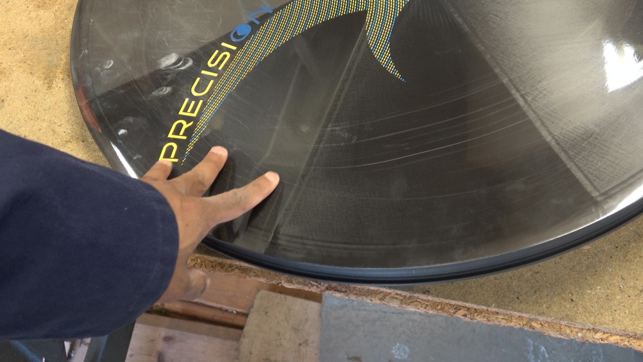 The Precision C21 features a unibody construction, meaning it is not merely a cover over a conventional spoked wheel. The center houses the DT Swiss hub, while the remainder of the disc is bonded in place. The disc’s boundary is a composite material sandwich, incorporating two carbon fiber skins with a central foam section. This design makes the wheel notably lightweight for a full disc.