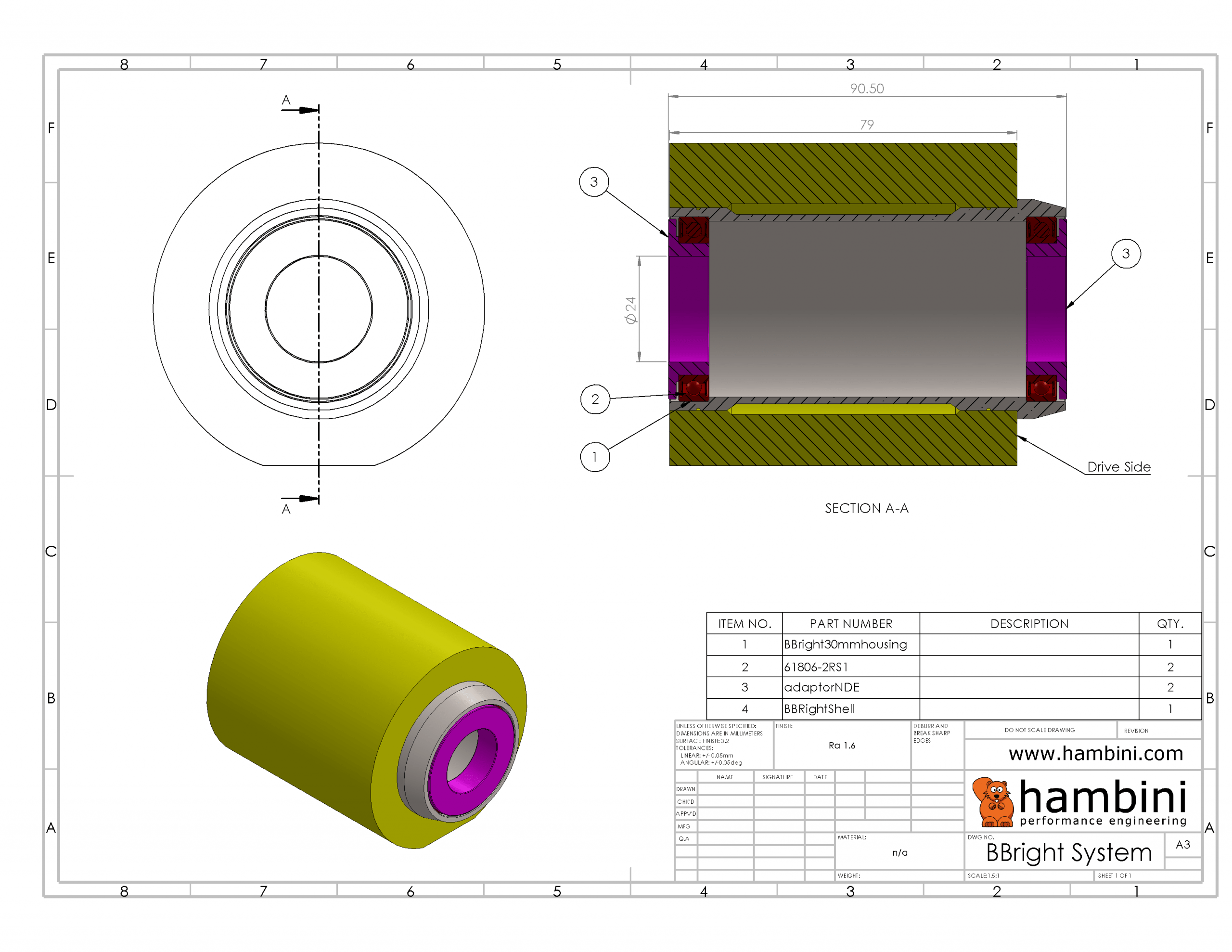 Hambini Bottom Brackets are amongst the lowest friction bottom brackets in the world. They are used by recreational cyclists, road racers, triathletes and time trialists from around the globe. They are of proven design and are manufactured in the United Kingdom. These units are of a one piece construction which makes them inherently resistant to creak, they will maintain perfect bearing alignment and function under loads in excess of 4000W.