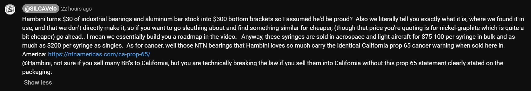 Josh claimed that Hambini (Hambini Engineering) was breaking the law by selling bottom brackets into the US without a Prop65 warning on them. This is factually incorrect as it would require the business to have more than 10 employees. He did not address the high levels of nickel in his lubricant and chose to direct the conversation towards bottom brackets made of “$30 industrial bearings and aluminium bar stock”.