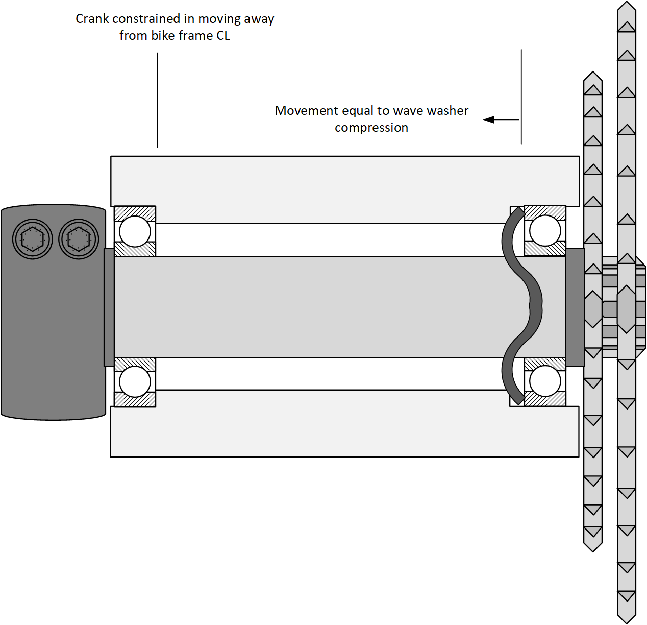 By virtue of the left and right load application of the pedaling action, the axial load going through a bottom bracket constantly changes direction. Additionally, a high degree of stiffness is desired as it’s the primary load input point. SKF, NTN and even FAG explicitly state the use of a wave washer in this application is not recommended. SKF explicitly state