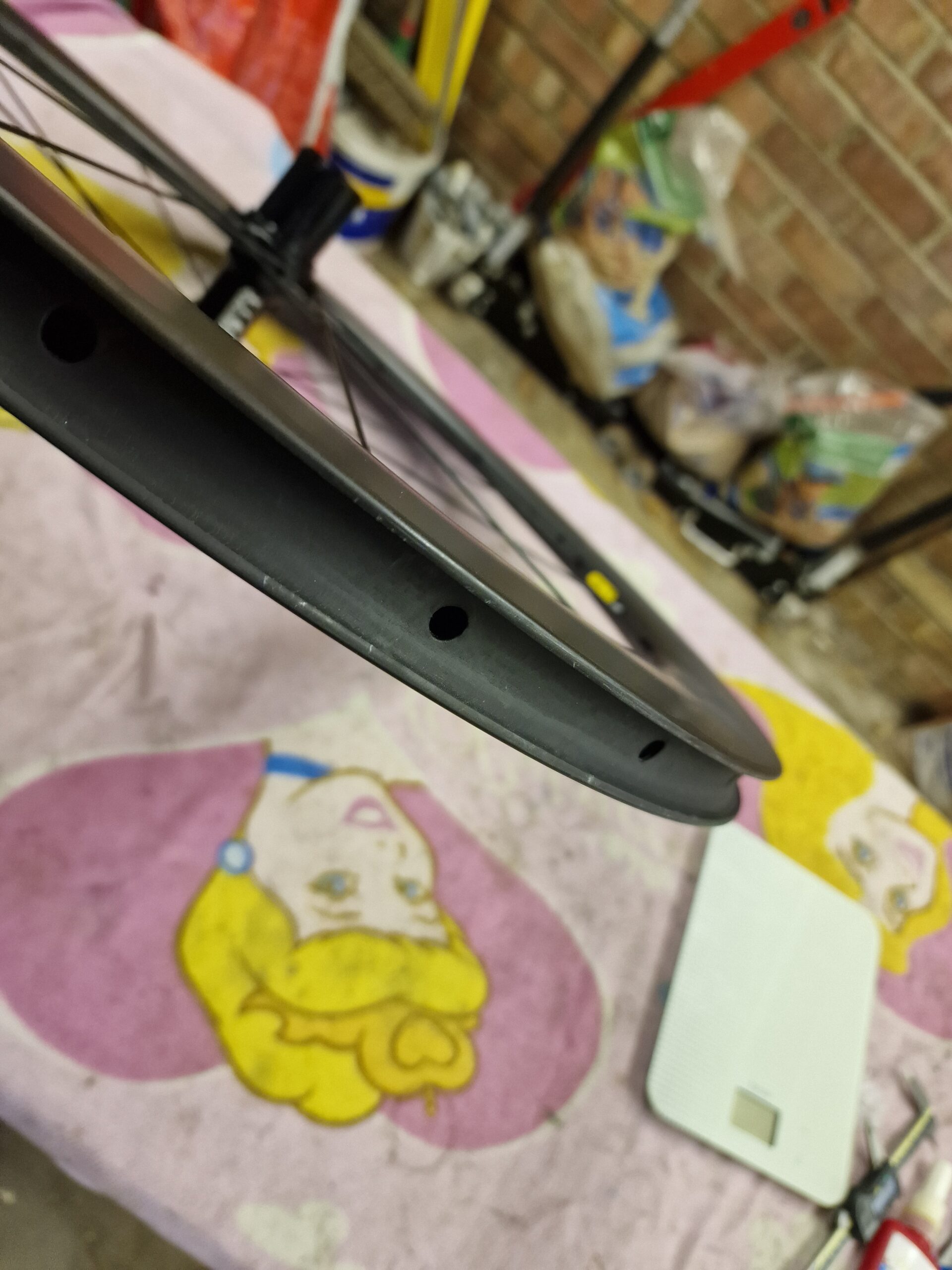 The wheel rims are fabricated using carbon composite material, featuring an external width of approximately 25mm and an internal width of 18mm. These rims incorporate a hooked bead design. The construction includes recessed spoke holes, necessitating the application of rim tape. Their design adheres to traditional specifications, consistent with models prevalent over the past several decades. The rim profile is characterized by a blunt toroidal geometry, a design paradigm that was predominantly favoured during the 2015-2020 timeframe but has since experienced a decline in popularity within the industry.